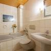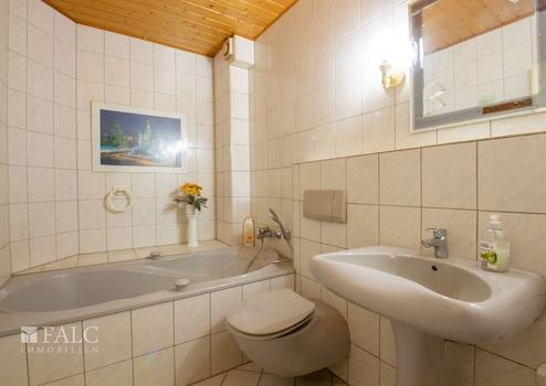 Das Badezimmer im Obergeschoss ist raumhoch gefliest und verfügt über eine Badewanne.