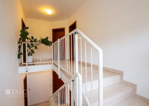 Die Verbindung der beiden Ebenen erfolgt über eine innenliegende Wendeltreppe, wie sie bei Maisonette-Wohnungen üblich ist.
