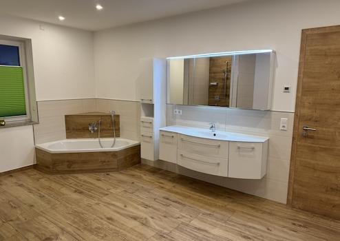 • Böden: Echtholzparkett (Eiche) in allen Wohn- und Schlafräumen. Hochwertige Fliesen in Holzoptik in Bädern, Küche, Flur unten und Abstellräumen