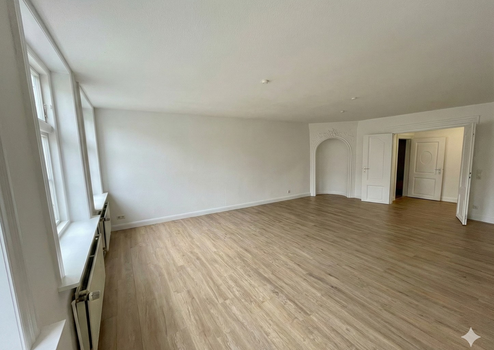 Großzügiges Wohnzimmer (41 m²): Das Herzstück der Wohnung beeindruckt durch eine weite Fensterfront, charmante Kaminnischen und klassische Flügeltüren. Ein Raum, der Geschichte atmet und gleichzeitig viel Platz für individuelle Entfaltung bietet.