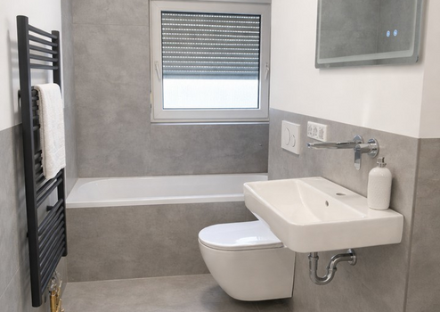 Das moderne Tageslichtbad überzeugt mit großformatigen Fliesen, Badewanne, wandhängendem WC, zeitgemäßem Waschtisch sowie einem Handtuchheizkörper. Die Küche ist separat gehalten und bietet ausreichend Platz für eine individuelle Gestaltung.