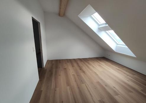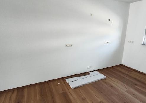 Das gesamte Erdgeschoss ist mit einer Fußbodenheizung ausgestattet. Als Bodenbelag sind Fliesen im Eingangsbereich und dem Gäste – WC verlegt, sonst ist im Erdgeschoss Vinylboden zu finden. Auf Wunsch kann das Haus mit einer Einbauküche angemietet werden