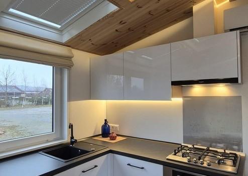 Im Innenraum treffen Funktionalität und Design aufeinander: Click-Wall-Wände im Wohnbereich, robuste Well-Plate-Verkleidungen im Bad sowie teilweise holzverkleidete Decken aus sibirischer Lärche schaffen eine warme, zeitgemäße Atmosphäre. Hochglänzende weiße Möbelfronten runden das elegante Gesamtbild ab.