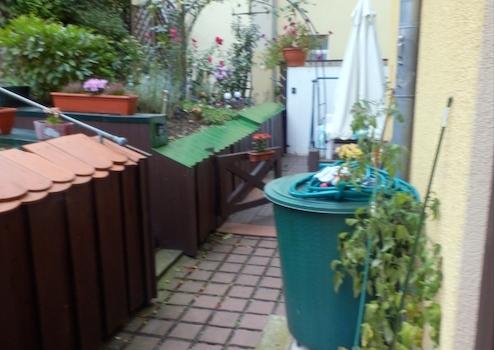 Im Erdgeschoss befindet sich eine Wohnung und ein Abstell- und Fahrradraum und der Durchgang zum hinten Teil des Grundstückes mit Garten. Zur Erdgeschosswohnung gehört ein Freisitz zum Garten.