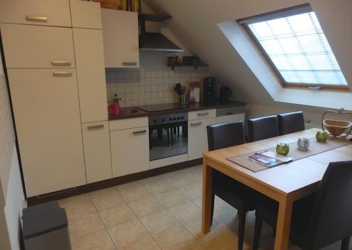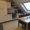 Die Dachgeschosswohnung verfügt über ein großes Wohnzimmer mit offener Küche.