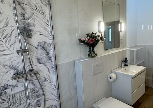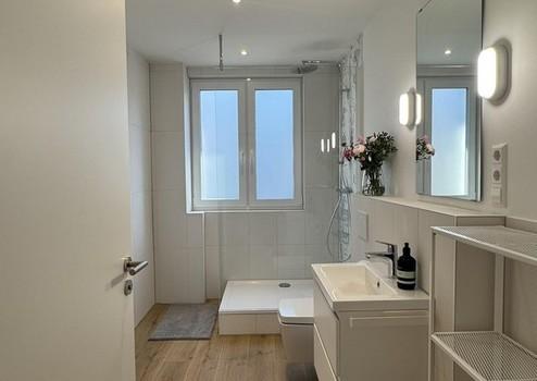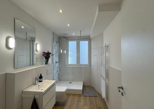 Zwei vollwertige Tageslichtbäder wurden als eigenständige Designräume konzipiert und ausgebaut. Hochwertige Armaturen, moderne Fliesen, elegante Spotbeleuchtung und komfortable Regenduschen sorgen für einen entspannten Start in den Tag und einen reibungslosen Ablauf im Alltag.
