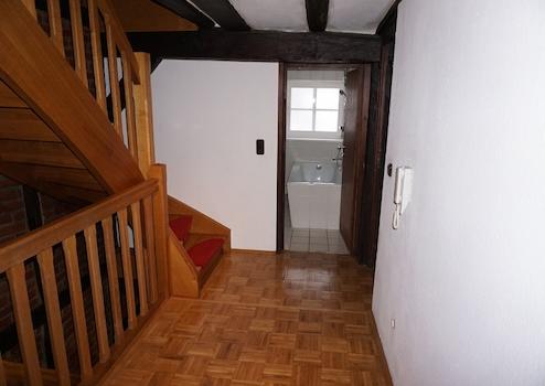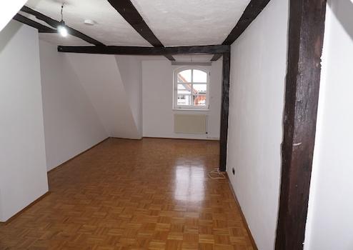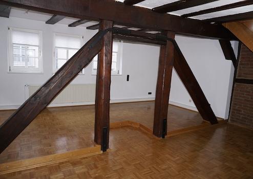 Diese Wohnung befindet sich zentral in der Melsunger Innenstadt, unweit des Marktplatzes. Sie liegt im 2. Obergeschoss des Hauses und erstreckt sich über 3 Etagen. Im 2. OG befinden sich die Küche, das durch offene Balken unterteilte Ess- und Wohnzimmer sowie ein Gäste-WC. Im 3. OG sind zwei Schlafzimmer, ein weiterer kleiner Raum und das Badezimmer mit Badewanne vorhanden. Im Dachgeschoss steht noch ein großzügiges Studiozimmer zur Verfügung. Die Wohnfläche beträgt insgesamt ca. 100 m².