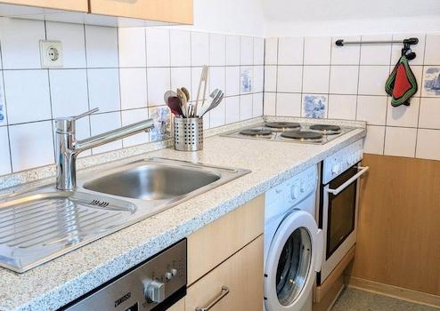 Die Küche ist voll ausgestattet mit: Backofen, Herd, Geschirrspüler, Waschmaschine, Kühlschrank mit Gefrierfach sowie Mikrowelle, Wasserkocher und Kaffeemaschine, etc.