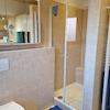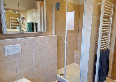 Das helle, in terrakotta geflieste Tageslichtbad verfügt über eine Dusche, zwei große Waschbecken und ein WC. Ein weiteres Gäste-WC ist im Eingangsbereich vorhanden. Im gemeinschaftlichen Waschraum im EG mit eigenen Anschlüssen für jede Wohnung ist Platz für Waschmaschine und Trockner. Die Waschküche und der Fahrradabstellplatz werden gemeinschaftlich genutzt.