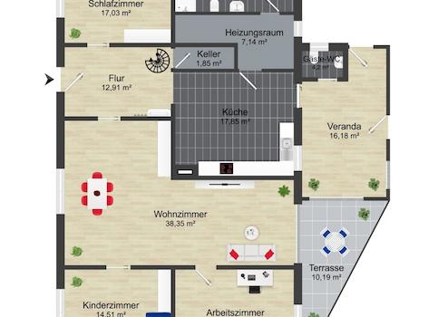 Im Erdgeschoss ließen sich mehrere Schlafzimmer sowie ein Arbeitszimmer realisieren und damit ideale Voraussetzungen für familiengerechtes Wohnen schaffen. Ergänzend finden ein Tageslichtbad, ein separates Gäste-WC sowie ein Hauswirtschaftsraum Platz. Die Küche könnte als funktionaler Mittelpunkt des Erdgeschosses ausgebildet werden. Das geräumige Wohnzimmer grenzt direkt an die Terrasse an und vermittelt ein helles und offenes Wohngefühl. Eine Veranda ergänzt das Raumangebot im Erdgeschoss.