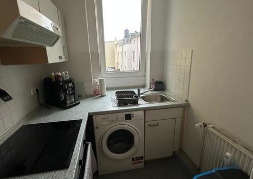 Die Waschmaschine findet in der Küche mit Einbaumöbeln ihren Platz - oder Sie nutzen den Münz Waschautomaten im Keller.