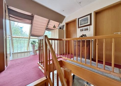 Mitten im Raum führt eine offene Vollholztreppe ins Obergeschoss, wo die Diele durch eine große schräge Dachfensterfront den Blick in den wunderschönen Garten und teilweise galerieartig in den zum Wohn- und Essbereich ermöglicht. Von hier aus wird Zugang zu drei Schlafräumen und dem Vollbad gewährt. Vom Schlafzimmer ist der geräumige Balkon zu begehen, der einen herrlichen Blick ins Grüne gewährt. Dieses Anwesen ist ideal für Familien, die angenehmes Wohnen in einer ruhigen Umgebung schätzen.