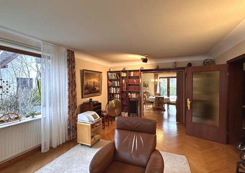 Im Erdgeschoss empfängt Sie eine großzügige Diele mit hohen Decken und durchgängig verlegtem Fischgrätparkett, das sich durch die gesamte Immobilie zieht. Das helle Wohnzimmer geht fließend in den Essbereich über, gegenüber befindet sich die Einbauküche. Zudem stehen ein saniertes, barrierefreies Duschbad, ein separates WC, ein Schlafzimmer sowie ein Arbeitszimmer mit Blick in den Garten zur Verfügung. Ein Naturschutzgebiet grenzt unmittelbar an das Grundstück.