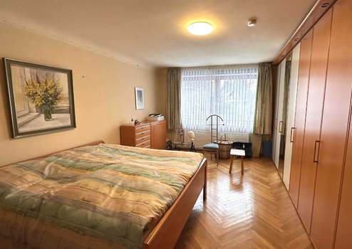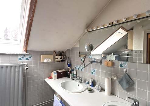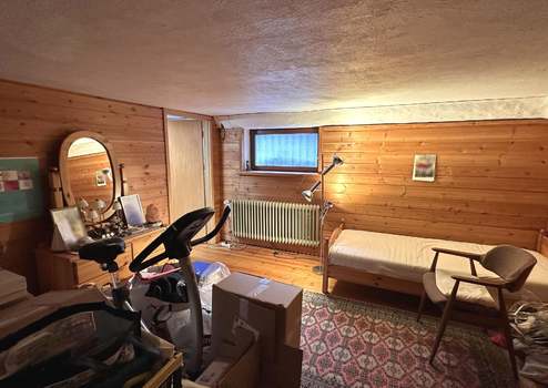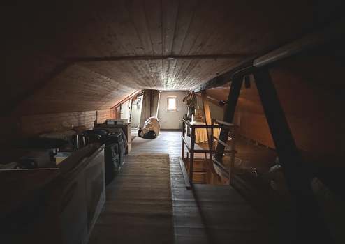 Im Obergeschoss befindet sich eine Einliegerwohnung mit Wohn- und Schlafzimmer, einem Arbeitszimmer, einer großzügigen, nach Süden ausgerichteten Loggia, einer Einbauküche, einem Duschbad sowie einem separaten WC. Abgerundet wird das Raumangebot durch einen Spitzboden mit umfangreicher Nutzfläche.