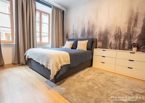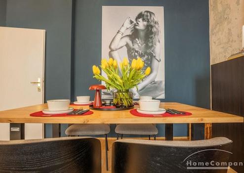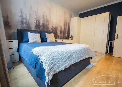 Das helle Wohnzimmer ist hochwertig eingerichtet mit einem komfortablen Sofa, einem Tisch mit Stühlen sowie einem Smart TV und lädt sowohl zum Entspannen als auch zum Arbeiten ein. Das stilvolle Einrichtungskonzept wird durch ein Hue-Lichtsystem ergänzt, das in mehreren Räumen für individuell anpassbare Lichtstimmungen sorgt. Das ruhig gelegene Schlafzimmer ist mit einem Bett in der Größe 160 × 200 cm sowie geräumigen Schränken ausgestattet und bietet viel Stauraum und eine angenehme Rückzugsmöglichkeit. Auch hier unterstreicht die geschmackvolle Möblierung den hochwertigen Gesamtcharakter der Wohnung.