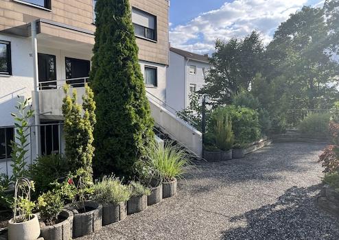 Ein weiteres architektonisches Highlight ist die überdachte und begrünte Garagenfläche, von der aus eine Treppe direkt zur Wohnung im 1. Obergeschoss führt. Diese Fläche wirkt wie eine vorgelagerte Terrasse und bietet zusätzlichen Raum zum Spielen, Verweilen oder Ankommen. Zur Wohnung gehört eine eigene Garage.