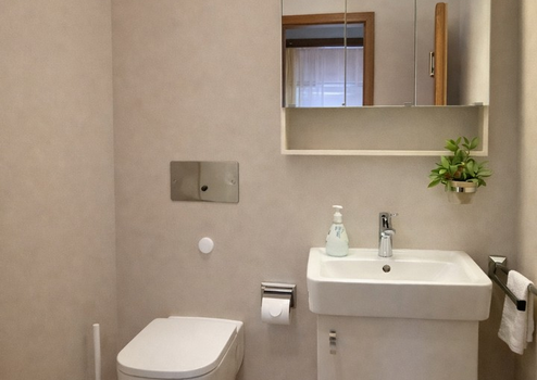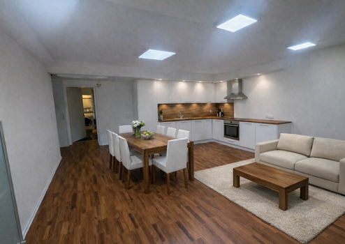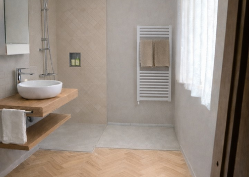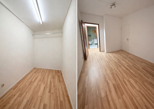 Die aktuelle Ausstattung der Immobilie ist auf den Bildern vollständig dargestellt. Zusätzlich zeigen die Visualisierungen mögliche kostengünstige und unkomplizierte Varianten zur kosmetischen Renovierung von Böden und Wänden, insbesondere in den Bädern. Diese dienen als Inspiration und verdeutlichen das Potenzial der Räume bei geringem Aufwand.