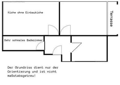 Die Wohnung umfasst ca. 47 m² Wohnfläche und bietet neben dem Wohnzimmer mit der vorgelagerten Terrasse eine große, separate Wohnküche (ohne Einbauküche!), ein (sehr schmales) Badezimmer mit Dusche und ein kleines Schlafzimmer.