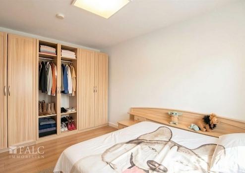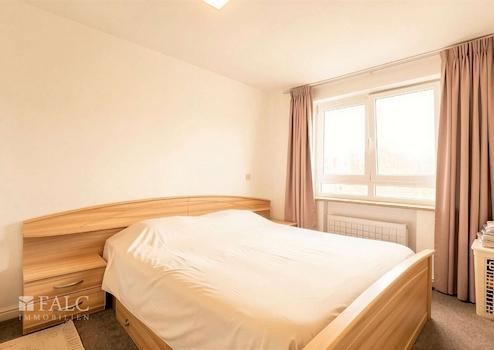Das Schlafzimmer ist geräumig und bietet genügend Platz für ein großes Bett und einen Kleiderschrank. Es ist ein ruhiger Rückzugsort, der durch seine Lage im hinteren Teil der Wohnung Privatsphäre gewährleistet.
