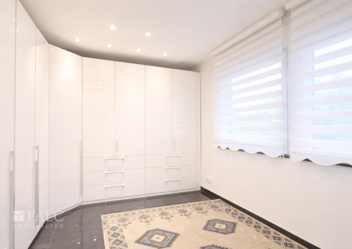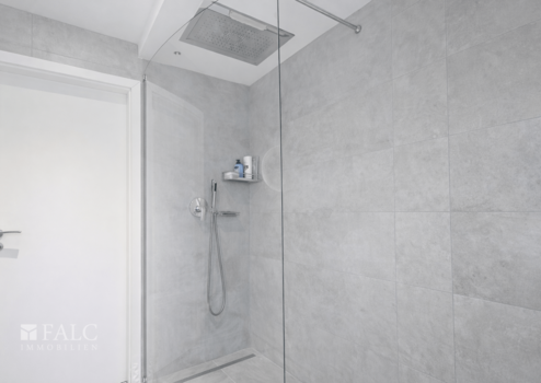 Im Erdgeschoss befindet sich der großzügige Wohn- und Essbereich mit direktem Zugang zum Wintergarten. Dieser stellt eines der besonderen Highlights der Immobilie dar und bietet dank großer Fensterflächen viel Tageslicht sowie einen freien Blick in den Garten. Die Küche befindet sich angrenzend zum Essbereich. Ebenfalls auf dieser Ebene befinden sich ein Schlafzimmer, ein modernes Badezimmer sowie eine separate Ankleide. Das Badezimmer ist hochwertig ausgestattet und verfügt über eine komfortable Regendusche.