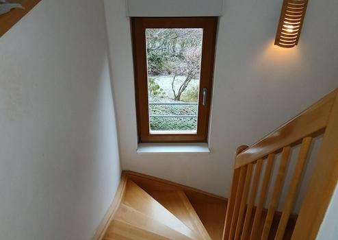 Endreihenhaus mit Schrägdach am Waldrand mit angenehmer Fußbodenheizung in allen Räumen, alle Wohnräume sind hell,helle Wohnküche, mit großer Tür zur Terrasse, Flur, Wohnüche im EG, dann eine Treppe hoch zum Bad, WC neu, Schlafzimmer, dann eine Treppe hoch zum Wohnzimmer, sehr große Fensterfront, sehr hell