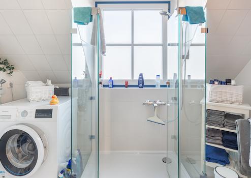 Zeitgemäß präsentiert sich auch die das hell geflieste Badezimmer, welches mit einer Dusche mit Glaswand sowie einem Waschmaschinen-Anschluss, Toilette, Handwaschbecken und großem Fenster ausgestattet ist.