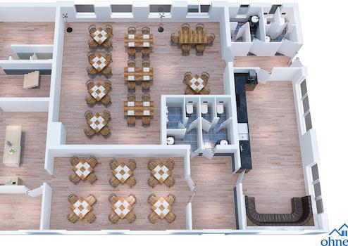 - EG: Gastraum inkl. Theke, großer Saal, Buffet-Raum, Küche, Kiosk, Damen-/Herren-WCs, Personal-WC und Lagermöglichkeiten.