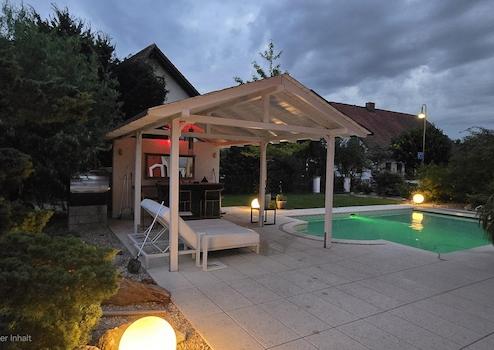 Sommers sitzen Sie Abends am geheizten Außenpool mit römischer Treppe und genießen im beleuchteten Felsgarten Ihr Glas Rotwein mit Blick auf den Sonnenuntergang über dem Stadtberger Wald. Der Wohngarten mit 3 großen und überdachten Terrassen nach West, Ost und Süd lädt an überdachter Bar vor dem Pizzaholzofen zum Verweilen ein. Die letzten Sonnenstrahlen im Dorf treffen Ihr neues Haus.