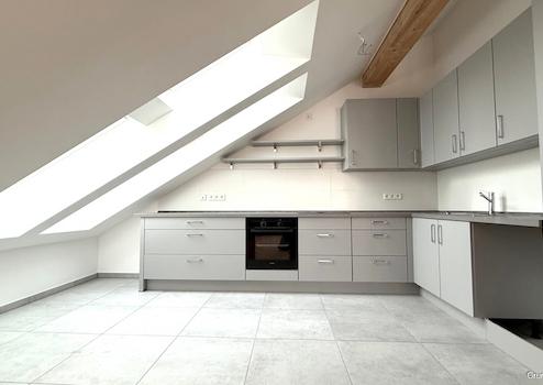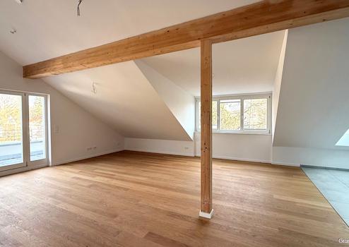 Somit handelt es sich bei der zu vermietenden Dachgeschosswohnung um Erstbezug nach hochwertigem Ausbau. Bereits beim Betreten der Wohnung empfängt Sie durch die enorme Deckenhöhe bis zum First und die großzügige Grundrissgestaltung ein sehr angenehmes und offenes Raumgefühl.