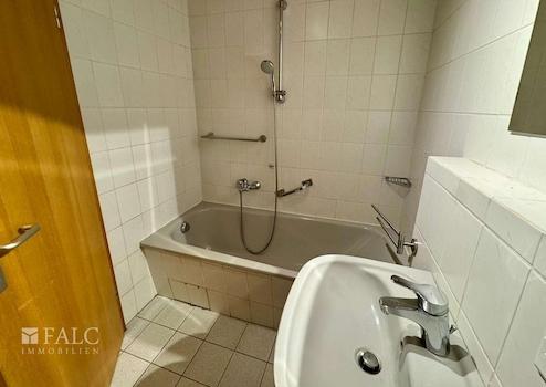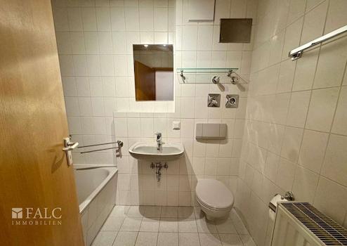 Das innenliegende Badezimmer ist funktional und zeitlos ausgestattet mit Badewanne, Waschbecken, WC und neuem Ventilator. Die Ausführung ist pflegeleicht und eignet sich sowohl zur direkten Nutzung als auch für eine spätere Modernisierung nach eigenem Geschmack.
