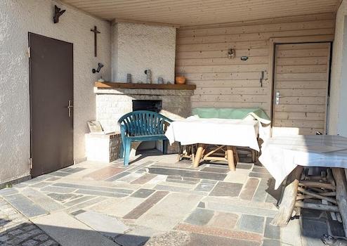 An die Garage ist ein zusätzlicher, gekühlter Lagerraum angebaut. Ein überdachter Freisitz mit offenem Kamin verbindet die Garage mit dem Haus, so dass Sie auch bei schlechtem Wetter trockenen Fußes über die Küche in das Haus gelangen können.