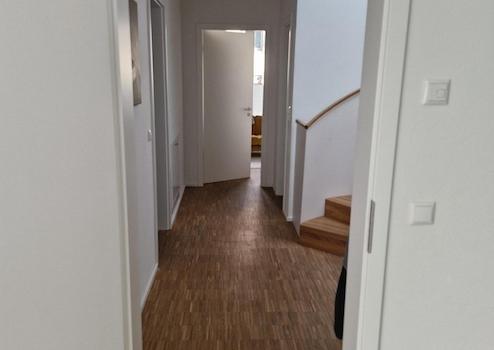 Auf dieser Ebene liegen zwei große Zimmer, eines davon mit eigenem Balkon. Ergänzt wird das Geschoss durch ein Bad mit moderner Glasdusche, ein separates WC sowie einen zentralen Flur. Ideal als Kinder-, Gäste- oder Arbeitsbereich – klar strukturiert und angenehm separiert.
