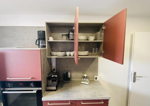 Zum Wohnen ist die komplette Küchenausstattung (Geschirr, Gläser, Besteck, Töpfe, Schüsseln, Nespresso-Maschine, Toaster, usw,) sowie Bettausstattung und Sanitärausstattung vorhanden.