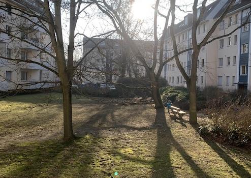 Ruhig gelegenes 1-Zimmer-Apartment im Hochparterre mit Gartenblick, kleinem Flur, Küche, Bad und Kellerraum.