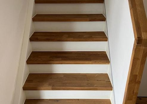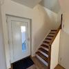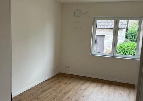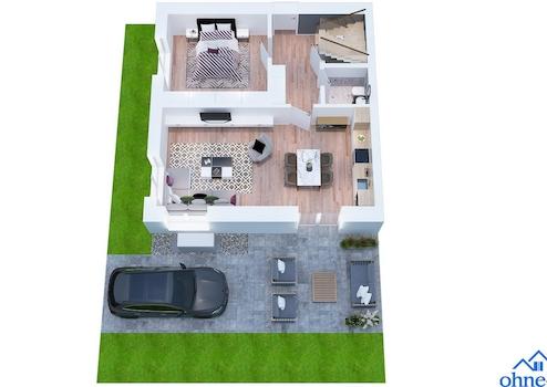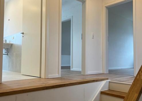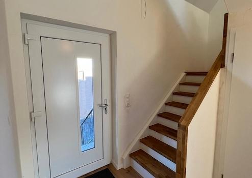 Der Eingangsbereich verfügt über ein offenes Treppenhaus mit hochwertigen Stufen aus massivem Eichenholz. Im Erdgeschoss befindet sich ein großzügiger, offen gestalteter Wohn- und Essbereich mit direktem Zugang zur Terrasse. Ein Panoramafenster sorgt für eine gute Belichtung und bietet einen direkten Blick auf das Wiehengebirge. Ergänzend stehen auf dieser Ebene ein weiteres Zimmer sowie ein Gäste-WC zur Verfügung.