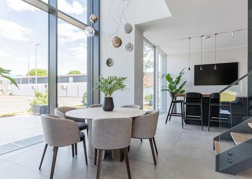 Die präsentierte Doppelhaushälfte beeindruckt mit einer klaren Bauhaus-Architektur und einem Flachdach. Besondere Merkmale dieses Doppelhauskonzepts sind die überdachten Terrassen im Erdgeschoss sowie die geschützten Balkone im Obergeschoss. Die kompakte Grundrissplanung macht dieses Haus besonders für schmale Grundstücke geeignet. Gegen einen Aufpreis können verschiedene Individualisierungsoptionen in Betracht gezogen werden, wie beispielsweise ein Carport oder eine Holzverkleidung am Giebel oder auf der Gartenseite.