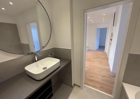 Zum Verkauf steht eine umfangreich modernisierte 5-Zimmer Eigentumswohnung mit zwei Balkonen, die sich sowohl zur Selbstnutzung als auch Kapitalanlage eignet (siehe Grundriss Nr. 2). Die erst kürzlich abgeschlossenen Arbeiten umfassten die Neugestaltung der gesamten Wohnung, einschließlich des Bades und der Küche u.A. mit verputzten und geschliffenen Wänden, Fliesen im Großformat 60x120 cm und 80x80cm und LED-Deckenspots in Flur und Bad. Die neue und offene Küche ist ausgestattet mit modernen grifflosen Fronten, Geschirrspüler, Induktionskochfeld, Kühl/Gefrier-Kombi, Backofen in moderner Höhe, uvm.