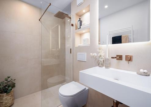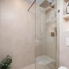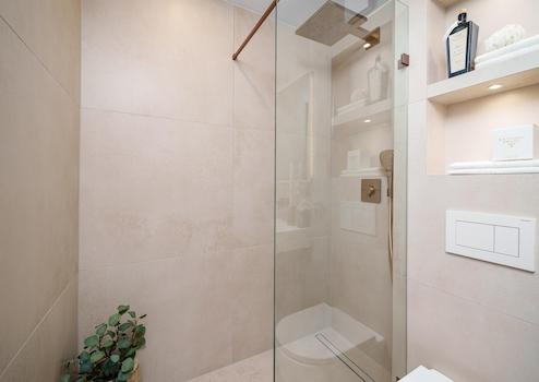 Das moderne, zeitlos LUXURIÖSE BADEZIMMER überzeugt mit einer eleganten BODENGLEICHEN REGENDUSCHE, hochwertigen HANSGROHE Unterputzarmaturen sowie einem stilvollen Mineralguss-Waschbecken und schafft eine private Wellness-Atmosphäre.