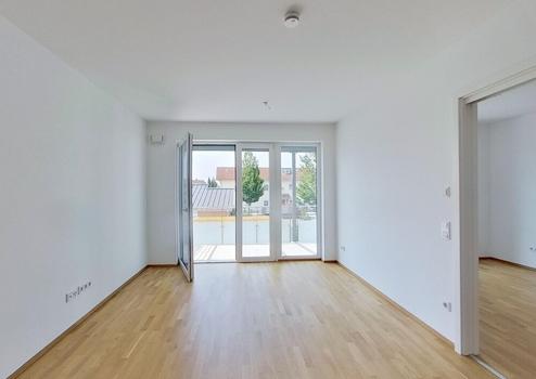 Geradeaus öffnet sich der Flur in den großzügigen Wohnbereich, der den Mittelpunkt der Wohnung bildet. Hier finden sowohl eine gemütliche Sofaecke als auch ein Esstisch problemlos Platz. Große Fensterflächen sorgen für eine helle, freundliche Atmosphäre und bieten Zugang zum Balkon, der zum Verweilen im Freien einlädt.