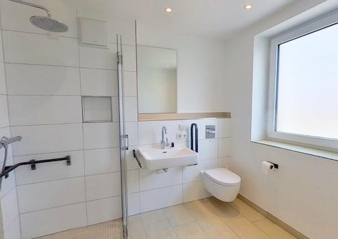 Rechter Hand befindet sich das moderne Badezimmer, ausgestattet mit hochwertigen Sanitärobjekten, einer bodengleichen Dusche sowie einem Waschbecken mit Unterschrank.