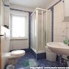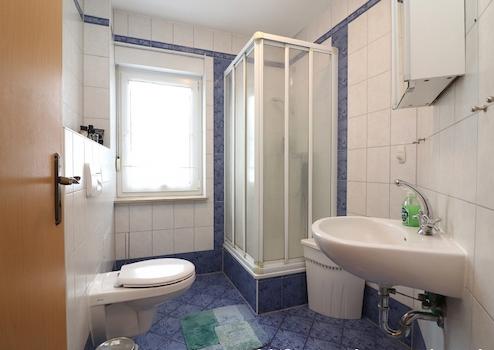 Gäste-Bad, gefliest, Dusche, Waschbecken, WC, Handtuchtrockner, Fußbodenheizung
