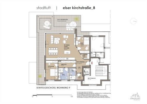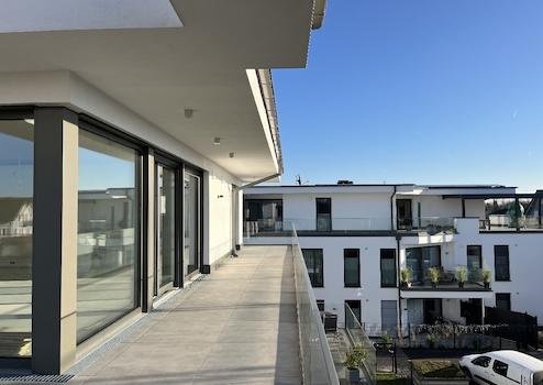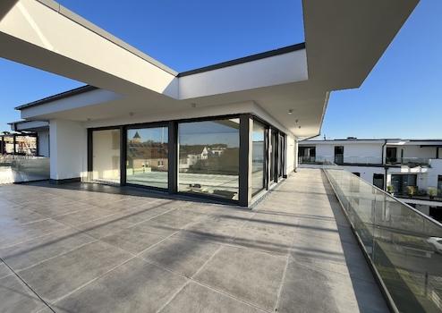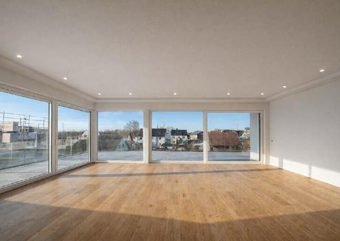 Das Herzstück der Wohnung ist der weitläufige Wohnbereich mit offener Küche, der dank großer Fensterfronten lichtdurchflutet ist. Von hier aus gelangen Sie direkt auf die geräumige Dachterrasse, die ideal für entspannte Stunden oder gesellige Abende ist. Der Schlaftrakt der Wohnung ist geschickt abgetrennt und bietet maximale Privatsphäre. Über ein praktisches Ankleidezimmer erreichen Sie das elegante Hauptbadezimmer, sowie das großzügige Schlafzimmer, dass ebenfalls Zugang zur Dachterrasse bietet und damit ein ruhiges Refugium mit viel Komfort darstellt.