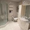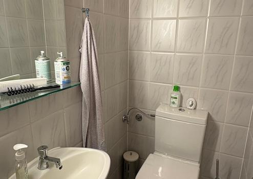 Das Bad im Obergeschoss verfügt über eine Dusche und eine Badewanne. Warmwasseraufbereitung erfolgt über einen Durchlauferhitzer.