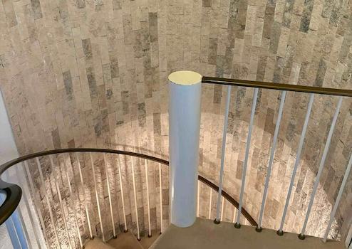 Über die Eingangsdiele gelangt man in das Treppenhaus, das offen im Esszimmer mündet. Von hier aus betritt man das Gäste-WC und die offene Küche.