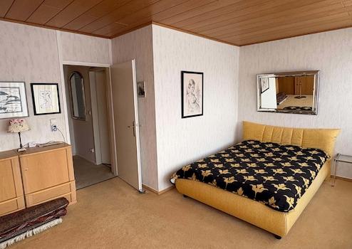 Über das Treppenhaus gelangt man in das Obergeschoss des zweigeschossigen Hauses, von dem aus ein zentraler Flur Zugang in ein großes Schlafzimmer mit Balkon gewährt. Außerdem befinden sich zwei weitere Schlafräume (Kinderzimmer) sowie ein geräumiges Badezimmer im Obergeschoss.