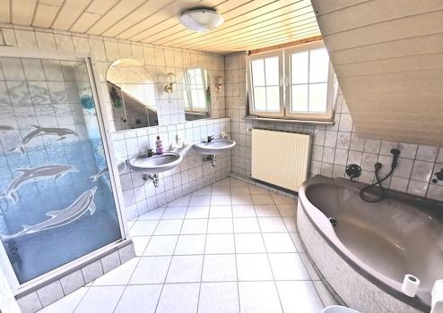 1 großes Tageslichtbad mit Eckbadewanne, Dusche, WC, Doppel-WB im OG