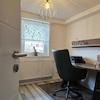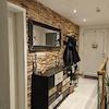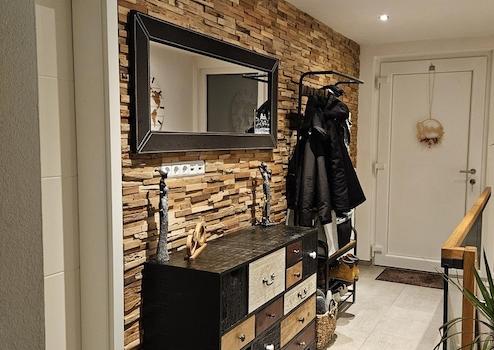 Bei der Sanierung wurde auf hochwertige Materialien geachtet. Im gesamten Haus sind Fliesen- oder Vinylböden verlegt, die von lokalen Händlern bezogen wurden. Die Bäder verfügen jeweils über auf Maß angefertigte Waschtische. Die Küche ist vom örtlichen Fachmarkt und mit einem Induktionskochfeld inklusive Abzug der Marke Bora ausgestattet. Der obere Flur wurde mit einer Holzwand individuell gestaltet.