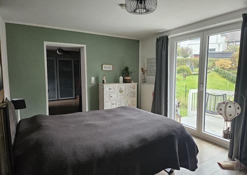 Über eine hochwertige und modern gestaltete Eichenholztreppe gelangt man in das untere Stockwerk, in dem sich zwei kleinere Zimmer befinden und ein größeres Zimmer mit Zugang zur unteren Terrasse und zum Garten. Außerdem verfügt die Etage über ein Gästebad mit Dusche und WC sowie einen Schwedenofen im Flur. Eine Waschküche und ein Heizungsraum, beide Zimmer ebenfalls mit Stauraum, runden das Untergeschoss ab.