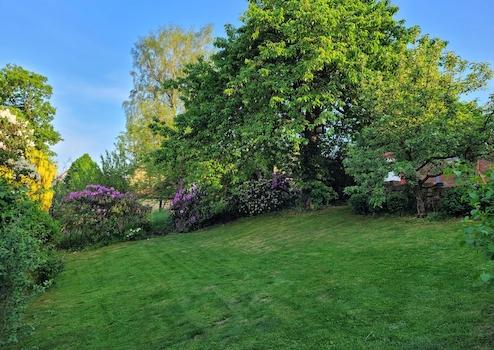 Der Garten ist wunderschön eingewachsen und blüht je nach Jahreszeit üppig. Viele Vögel, Igel und Eichhörnchen sind Gäste.