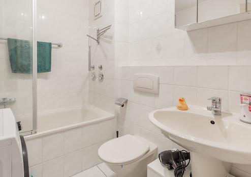 Im weiß gefliesten Vollbad (innen liegend) befinden sich neben einer Badewanne, einem Handwaschbecken und dem WC noch genügend Platz für eine Waschmaschine und eventuell einem Trockner.